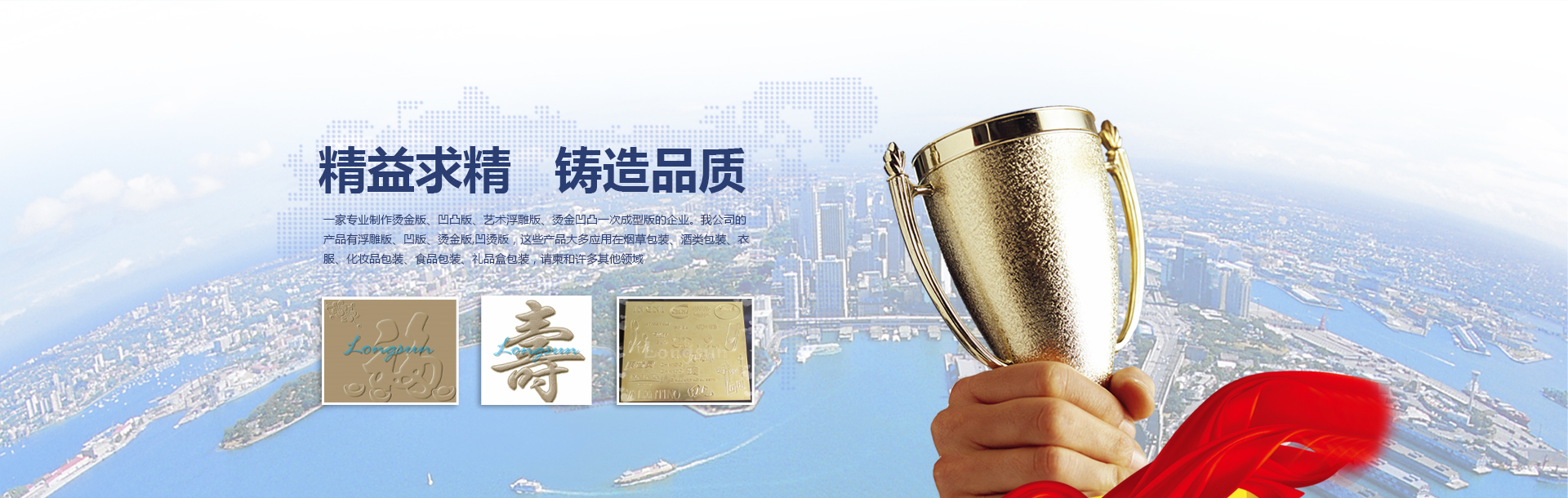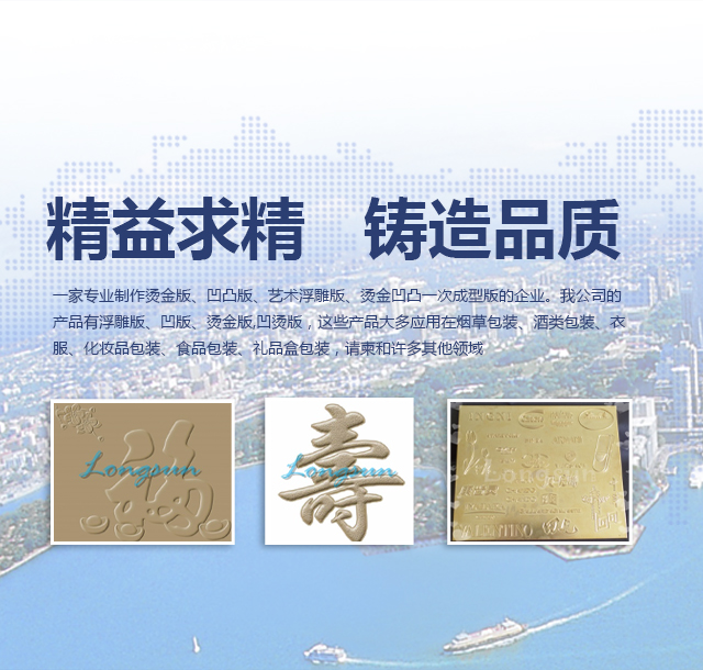 上海蓝之升模具有限公司位于上海市松江区,是一家专业制作烫金版、凹凸版、艺术浮雕版、烫金凹凸一次成型版的企业。我公司的产品有浮雕版、凹版、烫金版,凹烫版,这些产品大多应用在烟草包装、酒类包装、衣服、化妆品包装、食品包装、礼品盒包装,请柬和许多其他领域。曾为JUZUI,GUCCI,SWAROVSKI,LV ,PRADA,FENDI,DIOR,CHANEL,ROLEX,ARNANI, STARBUCKS, ESTEE LAUDER, 资生堂、520、中南海,黄鹤楼、红塔山、韩烟、茅台、郎酒、十八酒坊、剑南春、国窖、等知名品牌设计烫金及凹凸效果。我们采用先进的技术和设备,我们有很强的生产能力。经过多年的努力,我公司取得了巨大的飞跃。我们在工艺设计领域有许多人才。在印刷展上,我们的产品赢得了许多同行和许多客户的赞赏。